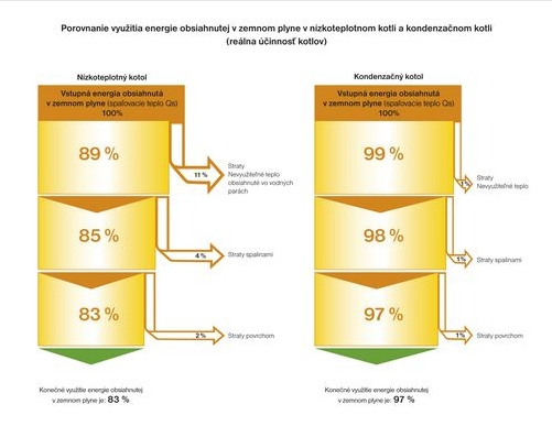 Nové kondenzačné kotle spĺňajú prísne ekonomické a ekologické kritériá požadované v rámci EU na tepelné zdroje. Sú v porovnaní s klasickými modernými kotlami úspornejšie v spotrebe zemného plynu (rozdiel až 30 %). Z enviromentálneho hľadiska zaťažujú životné prostredie podstatne nižšími emisiami plynov COx a NOx.